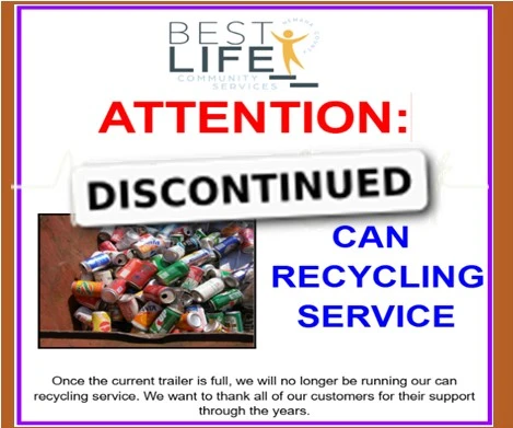 The Best Life Community Services will be discontinuing their Can Recycling Service. Their trailer is full, we will no longer be running the recycling service. We want to thank all our customers for their support through the years.
