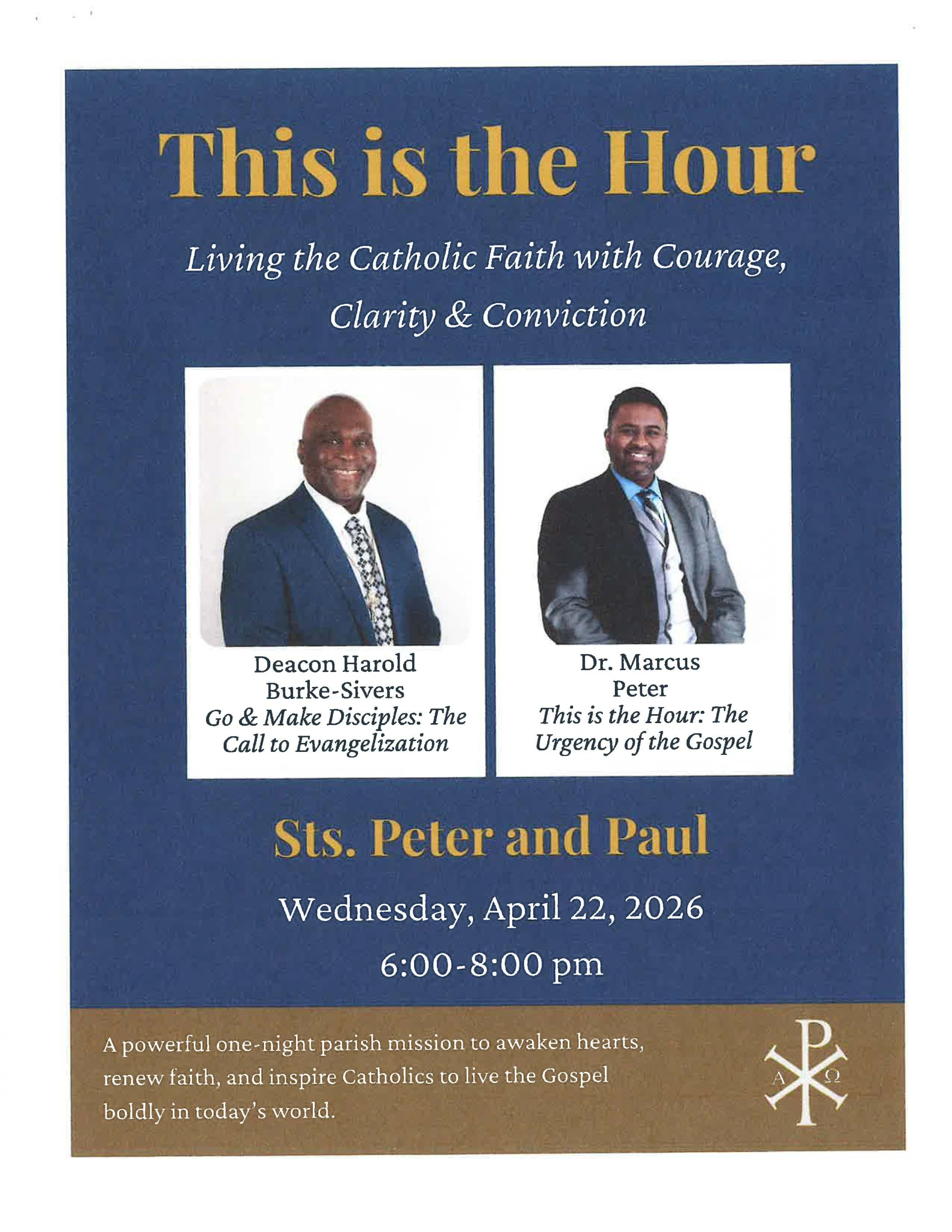 This is the hour, living the Catholic Faith with Courage, Clarity & Conviction with guest speakers Deacon Harold-Burke Sivers & Dr Marcus Peter in Seneca will give a powerful one-night parish mission to awaken hearts at the Saints Peter & Paul on Wednesday April 22nd from 6pm to 8pm