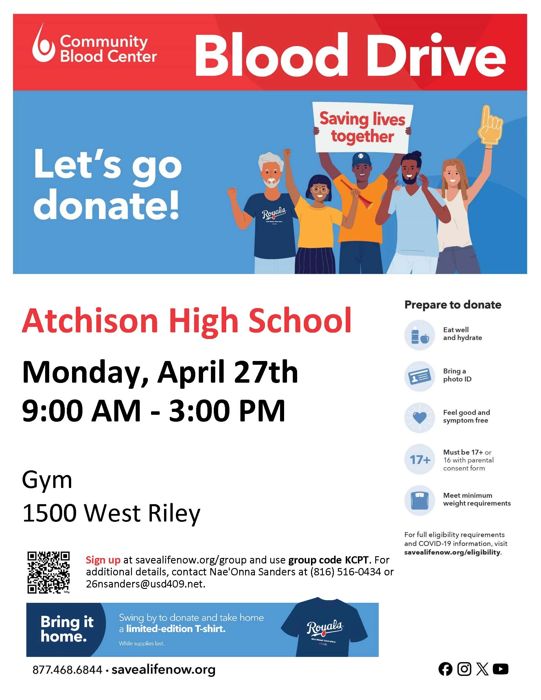 Atchison High School will have a Community Blood Drive on Monday, April 27th from 9am to 3 pm in the gym at 1500 West Riley in Atchison. Sign up at savealifenow.org/group and use group code KCPT. For additional details, contact Nae'Onna Sanders at (816) 516-0434 or