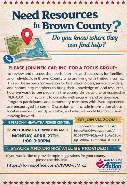Do you need Resources in Brown County? Please join NEK-CAP, Inc. for a Focus Group in person @ Hiawatha Fisher Center, 201 E Iowa St in Hiawatha on Monday, April 27th from 1-3p.m. or join via Zoom. Snacks & drinks will be provided. Go to https://mscnews.net/ Calendar events to check out the zoom links.