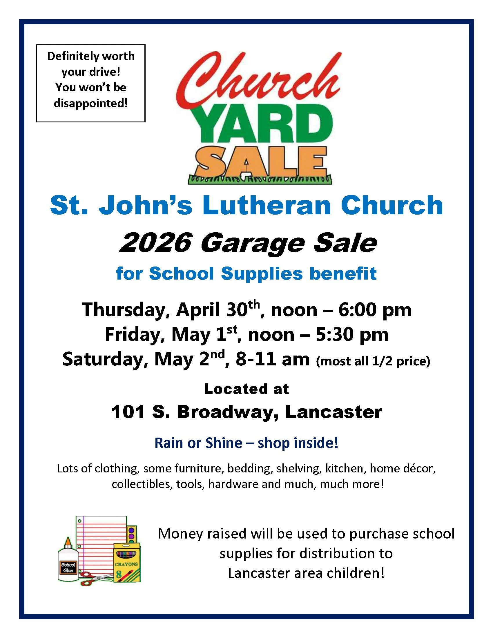 A Church Yard Sale will be held at St. John’s Lutheran Church at 101 S Broadway in Lancaster! This garage sale is for School Supplies Benefit for distribution to Lancaster Area Children. Rain or shine they will have lots of clothing, some furniture, bedding, shelving, kitchen items, home décor, collectables, tools, hardware & so much more! It will be on