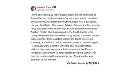 Trump, on Friday, took to his social media platform of choice, Truth Social, to say that after being "asked by many people about the life and times of Amelia Earhart," which he calls "an interesting story," as "her disappearance, almost 90 years ago, has captivated millions," Trump said he is "ordering my Administration to declassify and release all Government Records related to [Earhart], her final trip, and everything else about her."