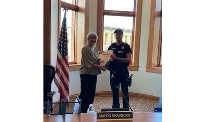 Mayor Becky Shamburg presented a certificate to officer Chance Johansen in recognition of his 5 years of service.