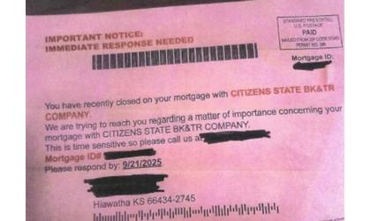 The Sheriff's Office has been informed recently that residents are receiving authentic looking notices in the mail from a local bank, Citizens State Bank, informing them that their mortgage has been closed.