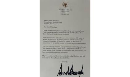 The Brown County Sheriff's Office, last week, received the letter of gratitude which said that Deputy Todd Widman, who died in the line of duty on March 1, 2000, "never wavered in his mission to protect and serve," with the letter adding that Widman's "legacy of selfless service will be an enduring reminder of his dedication to the citizens of Kansas and his pride in our Nation."