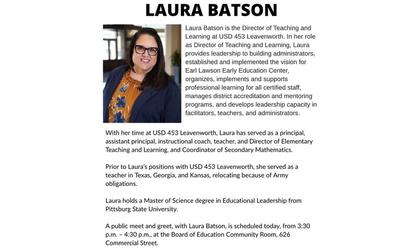 Announced this morning is the third of the three, identified by USD 409 as Laura Batson, the Director of Teaching and Learning at USD 453 Leavenworth.