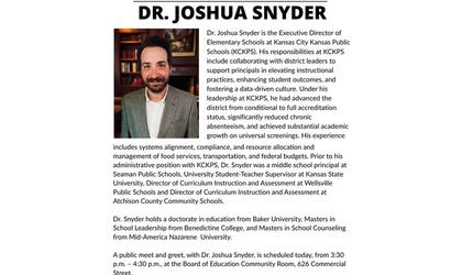 The first of three candidates, Dr. Joshua Snyder, will be on hand to meet with the public during that time. Snyder is the Executive Director of Elementary Schools at Kansas City Kansas Public Schools.