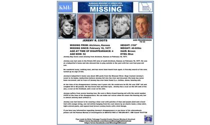 Jeremy Coots disappeared February 18, 1977, last seen in the Potato Hill area, south of Atchison, disappearing while playing outside. The five day search that followed led to no traces of the missing 4-year-old, including clothing or shoes. Investigators believe he fell into the Missouri River, about 400 yards from where he was last seen, but his body has never been recovered.