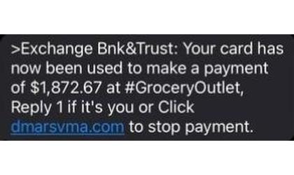 The message, which claims to originate from Exchange Bank and Trust, tells the recipient, "your card has been used to make a payment of $1,872.67" at what the message calls "GroceryOutlet." The message asks the recipient to reply or to click on an embedded link.