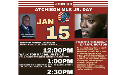 However, another special guest, Darryl Burton, who spent 24-years in prison, but was exonerated in 2008 when his innocence was proven, will not attend, leaving his book reading and reception postponed. However, work is underway to reschedule Burton's visit to Atchison.
