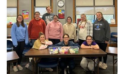 The picture accompanying this story is The Council for Exceptional Children members. They made sensory units for Calvert Elementary students in Auburn. Those participating in the Giving Day activity were: Front row (l to r) Mara Manzer (Auburn), Bernice Hilker (Omaha), and Riley Koch (Centralia, Kan.). Middle row (l to r) Zoe Ebel (Falls City), Megan Schmidt (Plymouth), Jordan Alves (Omaha), Grace Greenwood (Chappell), Mindy Bartels (Lincoln), and Kylie Hansen (Lincoln). Back row Steven Burgers (Bennington).