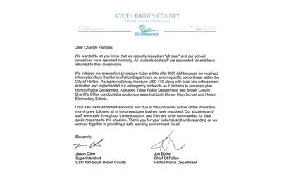 The Horton Police Department, the Kickapoo Tribal Police Department, and the Brown County Sheriff's Office conducted a search at both Horton High School and Horton Elementary School with nothing found.
