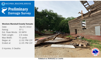 (KMZA)--The National Weather Service has confirmed an EF1 tornado touched down in western Marshall County late Tuesday night about four miles southwest of Marysville.