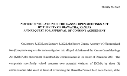 The investigation, launched by Brown County Attorney Kevin Hill, followed what the Notice of Violation calls "two separate requests for an investigation into alleged violations of the Kansas Open Meetings Act by one or more Hiawatha City Commissioners in the month of December 2021."