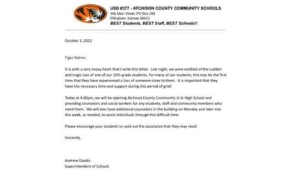 The letter explains that the school district was notified Saturday night of what Gaddis calls "the sudden and tragic loss" of a 12th grade student.