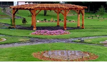 The Cancer Memorial Garden features a variety of plants, trees and flowers along with benches, stones and a paved path forming a Cancer Ribbon circling a 34-foot open octagonal pergola.