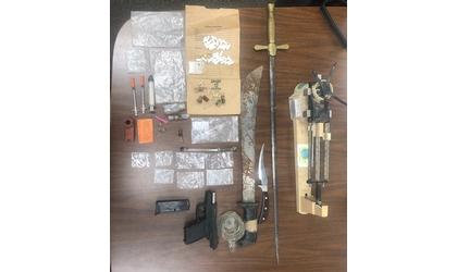 Officers also located a handgun, which was allegedly stolen, a large machete style weapon, a large fixed blade knife and a sword.