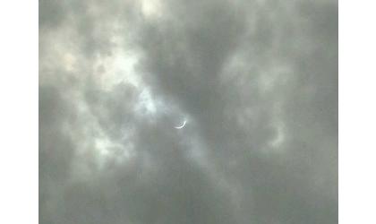 Despite dense clouds, and occasional pouring rain, the clouds parted just enough at 1:06 in the afternoon for the soggy airport crowd to view glimpses of the several stages of the event.