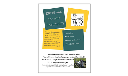“Hiawatha Ford has generously offered to do a ‘drive-one for your community’ event with Brown County Humane Society being the beneficiary of the funds,” said Brown County Humane Society Manager Phyllis Schaefer. “For every person that comes out and does a short test drive, Ford donates $20 to us. We can get up to $6,000 if we can get 300 people to do the test drives.”