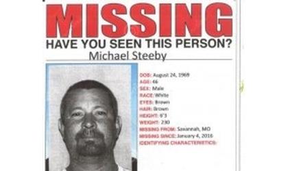 The St. Joseph News-Press reports 46-year-old Michael Steeby of Savannah was last seen around 1:30 the afternoon of January 4 at his home. He was reported missing two days later, sparking a search by local police and numerous other law enforcement agencies.