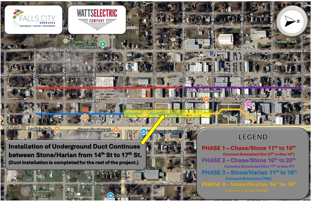 Falls City Public Works Director Trevor Campbell reports that contractor, Watts Electric will be contacting each affected customer to schedule a temporary outage in order to cut over their electric service from the existing overhead lines to the newly installed underground system.