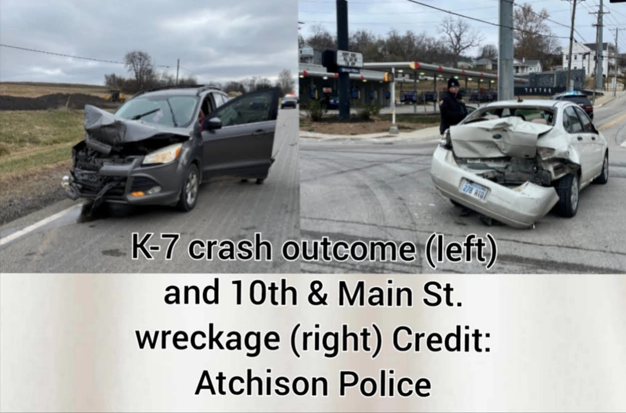 The second wreck, this one at 2:15 Sunday afternoon, happened at K-7 Highway and Royal Road where, Wilson says, a Ford Escape, driven northbound on the highway by 18-year-old Atchison resident Abrie Handke struck the rear of a Chevrolet Equinox in front of her, and driven by 32-year-old Kiley Surritt, of Atchison.