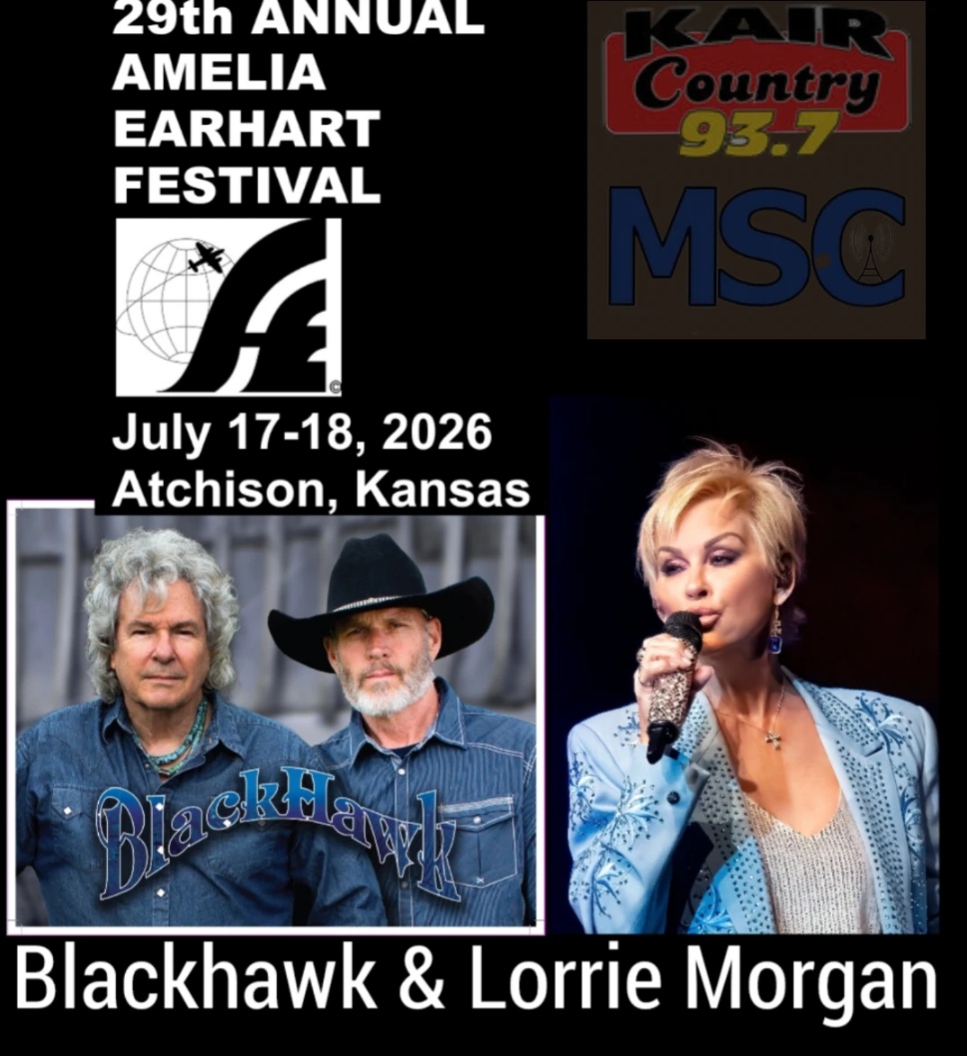 Headlining the July 17 concert, to again be held at the Atchison Riverfront, is the country music of Blackhawk, followed by that of Lorrie Morgan. “We can’t wait for Music on the Riverfront this year!! We’re excited about BlackHawk! I’ve had so many requests to bring them to the Amelia Earhart Festival! We’ve finally done it!,” Pregont stated. “And Lorrie Morgan has one of those voices that captivate an audience! BlackHawk harmonies and Lorrie Morgan’s voice – what a tremendous night of entertainment to look forward to!”
