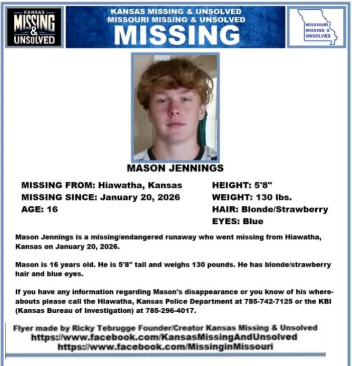 Sixteen-year-old Mason Jennings has been missing since January 20. He was last seen in Hiawatha, and his current whereabouts are unknown.