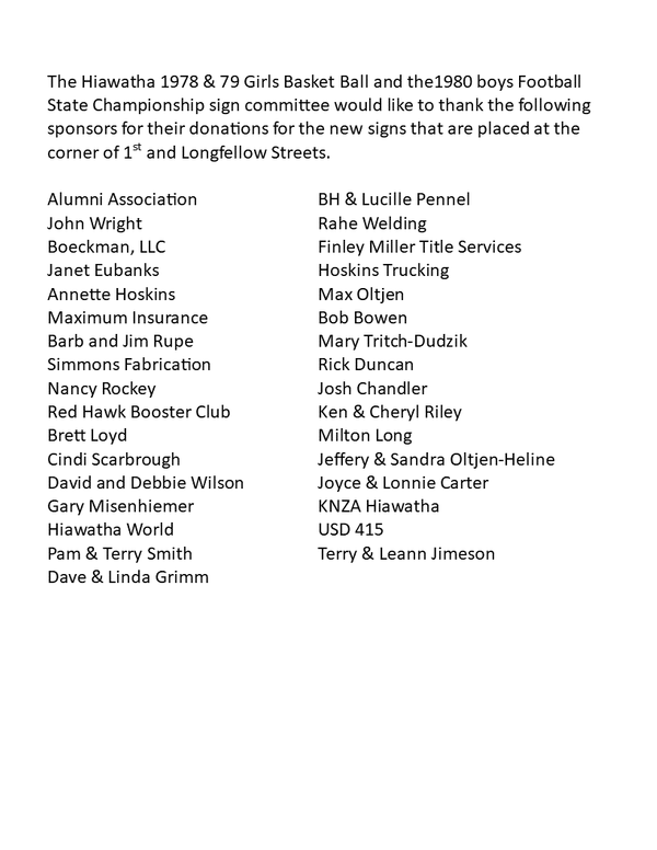 The Hiawatha 1978 & 79 Girls Basket Ball and the1980 boys Football State Championship sign committee would like to thank the following sponsors for their donations for the new signs that are placed at the corner of 1st and Longfellow Streets.