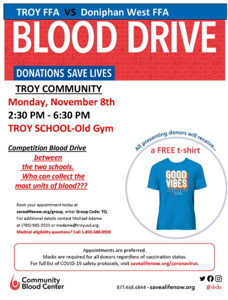 Troy Public Schools, USD 429 VS. D WEST with Blood Drive Posted October 22, 2021 01:03pm Troy Public Schools, USD 429 66ttOS7ctpo74b0euro 11 aht9fh nor9l6:d0a2 AM · Read All