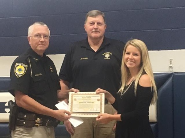 We are very proud to announce the first recipient of the "Brown County Sheriff's Office Memorial Scholarship" which is dedicated to those who have given the ultimate sacrifice in the line of duty. Abigail Vaught, senior at Horton high school was awarded the scholarship Tuesday evening May 9th, at the Horton high school gymnasium. Brown County Sheriff John Merchant and Public Safety Resource Deputy J. D. Clary presented the $1,000 scholarship along with a certificate and a Sheriff's challenge coin. The coin was designed in honor of Deputy Todd Michael Widman, who lost his life serving the citizens of Brown County on March 1, 2000.