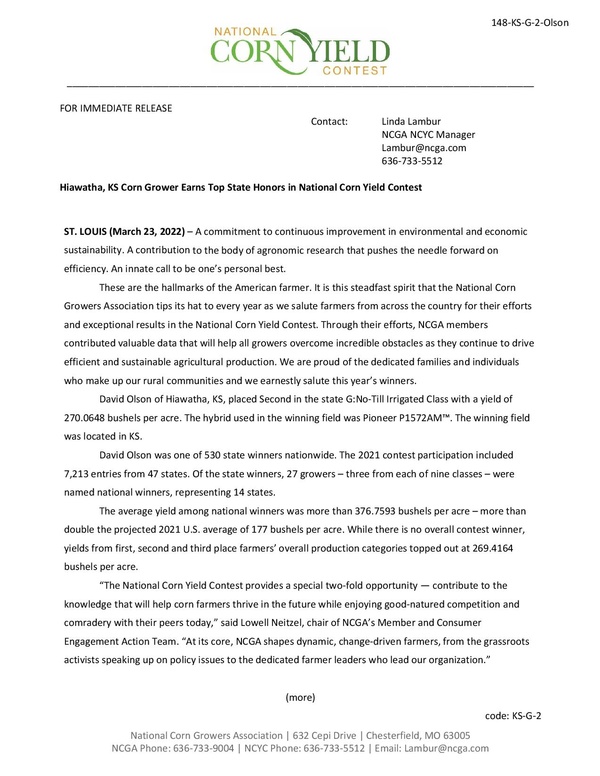 Hiawatha, KS Corn Grower Earns Top State Honors in National Corn Yield Cont Posted March 23, 2022 11:23am Hiawatha, KS Corn Grower Earns Top State Honors in National Corn Yield Contest David Olson Congratulations! Read All