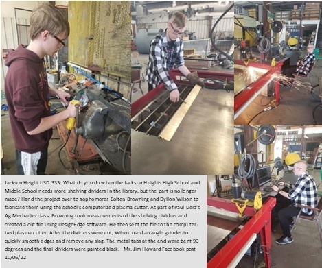 Jackson Height USD 335: What do you do when the Jackson Heights High School and Middle School needs more shelving dividers in the library, but the part is no longer made? Hand the project over to sophomores Colten Browning and Dyllon Wilson to fabricate them using the school's computerized plasma cutter. As part of Paul Lierz's Ag Mechanics class, Browning took measurements of the shelving dividers and created a cut file using DesignEdge software. He then sent the file to the computerized plasma cutter. After the dividers were cut, Wilson used an angle grinder to quickly smooth edges and remove any slag. The metal tabs at the end were bent 90 degrees and the final dividers were painted black. Mr. Jim Howard Facebook post 10/06/22