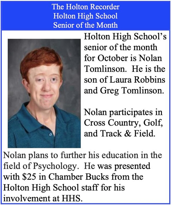 HOLTON HIGH SENIOR OF THE MONTH OCTOBER 2022 Posted October 12, 2022 11:16am HOLTON HIGH SENIOR OF THE MONTH OCTOBER 2022 Congratulations to Nolan Tomlinson for being Holton HS Senior of the Month for October. 10/12/2022 FACEBOOK POST Read All