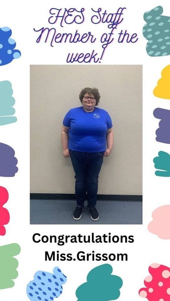 USD 430 HES Staff Member of the Week 1/16/23 Posted January 17, 2023 12:08pm Congratulations to Miss. Grissom on being selected as the HES Staff Member of the Week! Miss. Grissom takes such pride in helping her students! Thanks for all you do!! Read All