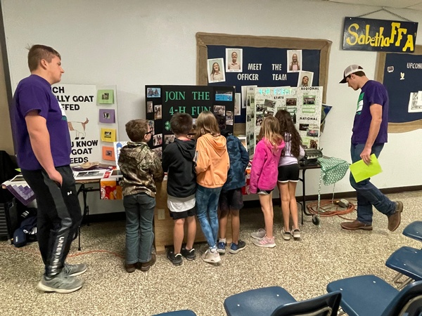In the photo are 4-H Ambassadors Luke Renyer and Owen Strathman talking to Sabetha 3rd graders.