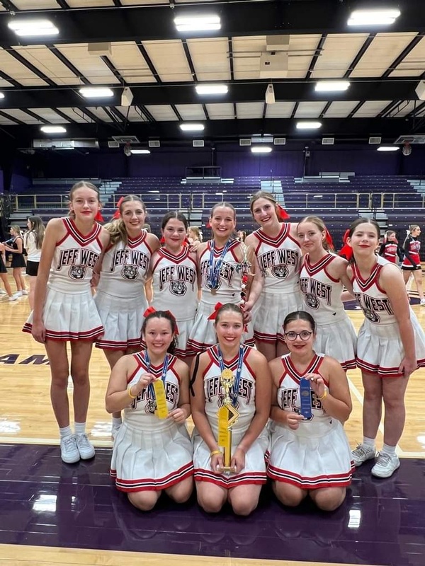 The Jeff West Varsity Cheerleaders had a VERY successful UCA camp in El Dorado this past week. They worked hard as a team and grew their skills. They came away with quite a few awards! Brianna Bartlett, Ashley Moser, and Katelyn Petesch tried out and were named All-American Cheerleaders, the team earned a blue ribbon for their Spirit Routine Evaluation, a GOLD for their Camp Routine Evaluation (the only gold given that night!), and a GOLD/1ST PLACE OVERALL IN THE SPIRIT CHAMPIONSHIP ROUTINE on the final day!!! We are so excited to watch this team continue to improve and perform for their fans! GO TIGERS!!