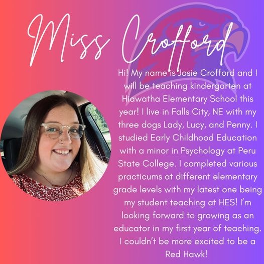 Hiawatha Elementary Welcomes New Kindergarten Teacher!! Posted August 02, 2024 04:48pm Please join us in welcoming Miss Josie Crofford to Hiawatha Elementary! She will be joining us as a kindergarten teacher! Read All