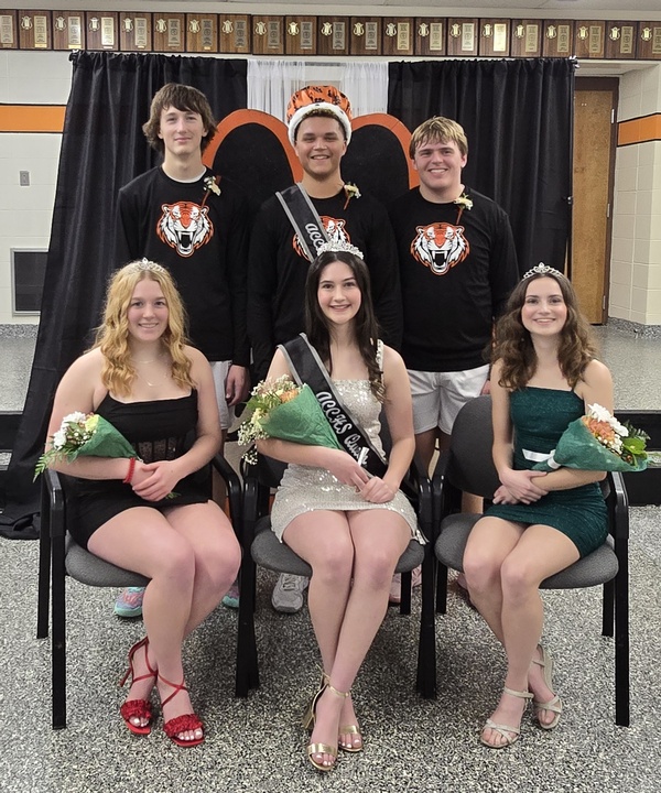 Atchison County Community Junior Senior High School congratulates the 2025 King and Queen of Courts and their court, who were crowned at halftime of the boys' varsity basketball game with Riverside HS on Tuesday, January 14, 2025. Stephan Feek was crowned King of Courts and Gracie Kimmi was crowned Queen of Courts. Rounding out the royal court were candidates Caden Behrnes, Rebekah Caplinger, Nate Oom, and Mackenzie Scholz. Assisting with the crowning were representatives of the ACCHS Cheerleaders and Student Council, and announcer, Junior Class President Avery Gilliland.