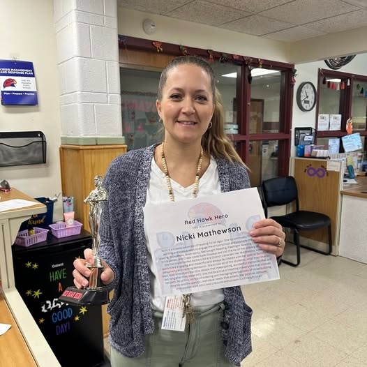 Please join us in congratulating our next HES Red Hawk Hero. A Red Hawk Hero is someone who exhibits characteristics of a hero. Our next recipient is Nicki Mathewson, our district librarian.