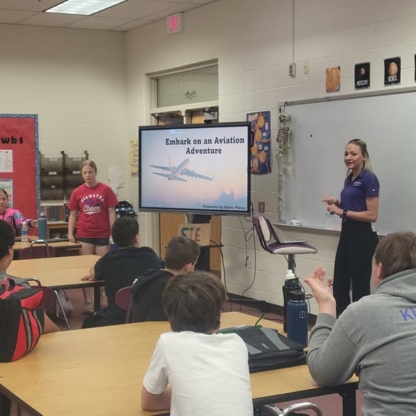 HMS 7th grade Flight and Space students were happy to welcome Hiawatha alumni, Bailey Pierce! Bailey shared her knowledge on all things aviation as she works to get her degree in Aeronautical Science with a minor in Aviation Safety at K-State Salina! She taught the students about the history of flight, how planes actually fly and her path towards gaining her Pilot's License! Thank you, Bailey!