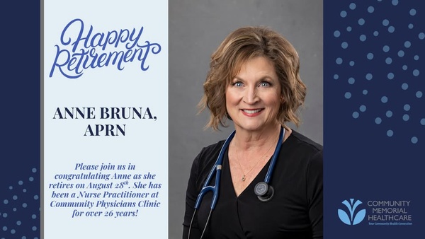 Anne Bruna Retires Posted August 18, 2025 03:42pm Congratulations to nurse practitioner, Anne Bruna, on her retirement from Community Memorial Healthcare in Marysville. Anne has been with CMH for over 26 years! Follow the link below for more information about Anne and her plans for retirement. http://www.cmhcare.org/.../Anne_BrunaAPRN_Retires_from... Read All