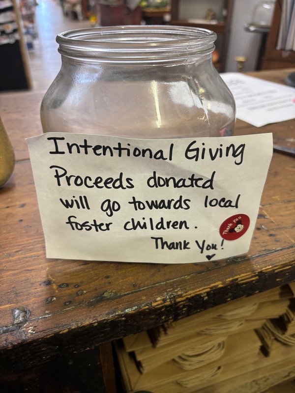 Intentional giving is a program in which 20% of what they take in on second Saturdays is given to the local foster care director to assist with immediate needs. In addition, they leave a jar on the counter for anybody wanting to just make donations while shopping any other time. They hope that this is something that is helping the program to buy things that are needed at once.