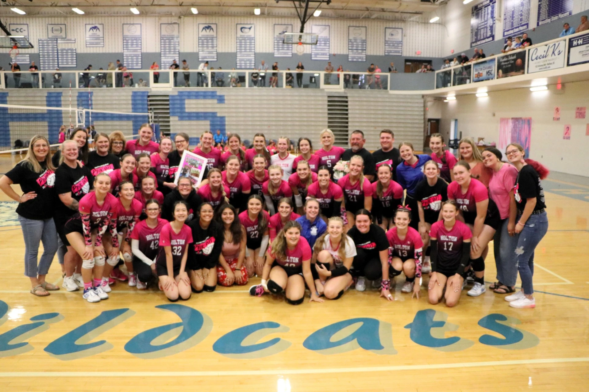 The Holton Volleyball team has raised a record amount during their 2025 Pink Out. The record for the past 2 years was $7000 to give to a local recipient that is battling cancer or still paying down bills from previous treatments. This year the team blew the record out of the water! They raised $10,000. The seniors lead the charge as they broke the team up into 7 different Pink Out Teams. Teams included students that were freshmen through seniors. This year's local recipient was elated with being selected, she is also the mom of our senior players.