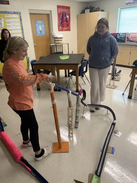 HMS 7th grade physics engineers at work. Students were to design, construct and calculate the acceleration, forces, and apply laws of motion to their roller coaster. We had almost 100% rate of all riders(marbles) making it successfully through all loops and turns! Awesome job!