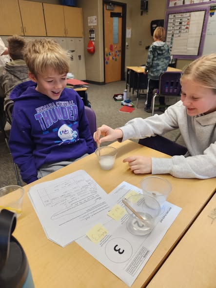 During Nemaha Central Elementary & Middle School Science class, 5th graders explored chemical reactions by mixing different substances in water. Substances included: citric acid, baking soda, and calcium chloride. Students observed the effects of these mixtures and recorded the products of each reaction.