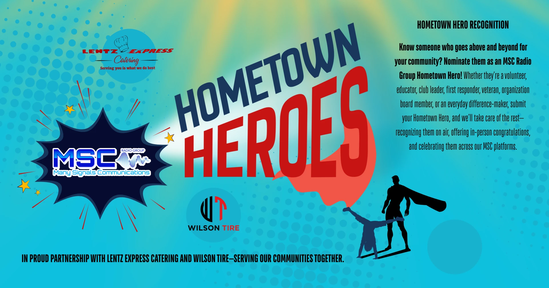 Simply complete the form below to nominate your Hometown Hero. MSC Radio Group will take care of the rest—sharing their story on air and across our platforms, with help from our proud partners Lentz Express Catering and Wilson Tire.